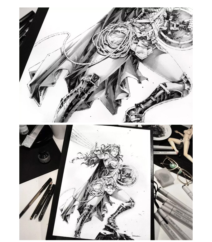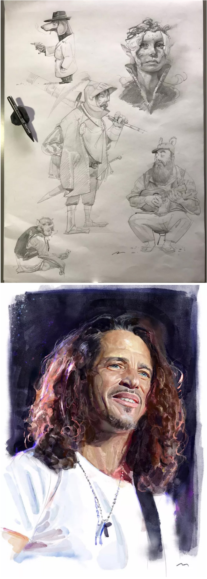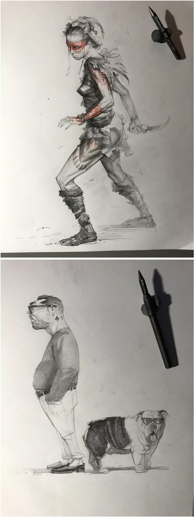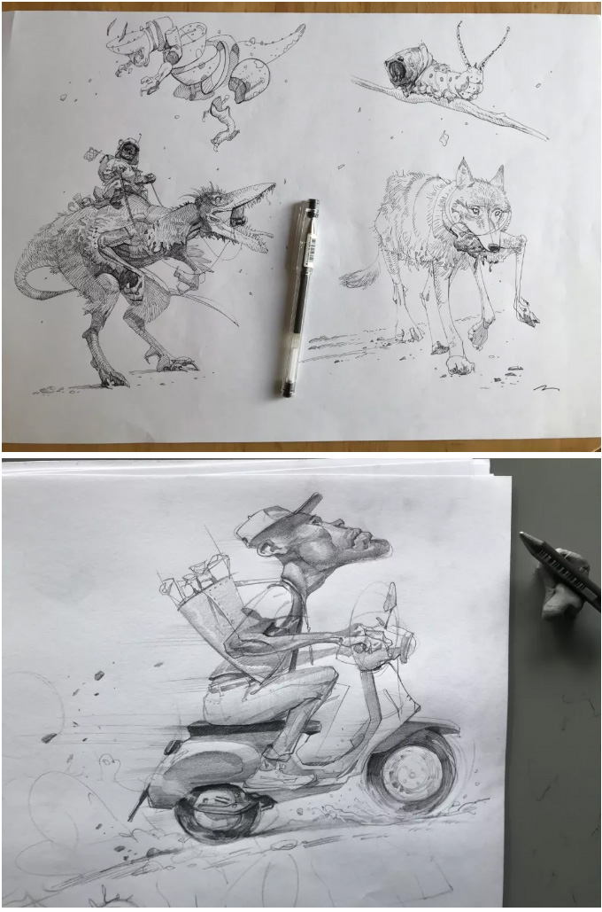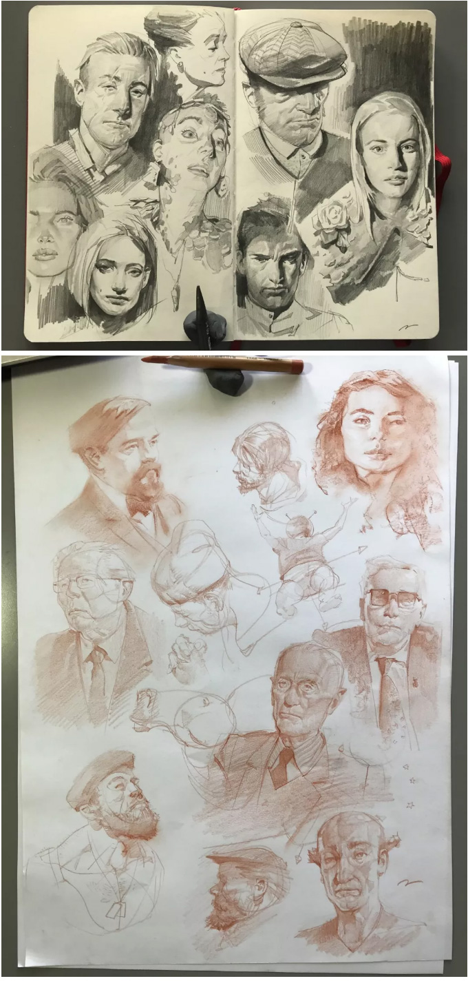 意大利的概念设计师、插画师, 常以影视、游戏角色作为练习对象, 大量的日常练习,锻炼出其超扎实的人物刻画和色彩运用, 就算是日常练习,也一点都不含糊, 简单地在本子上进行速写,也能通过明暗关系来生动刻画, 通过对动作、神态和服饰的刻画,人物的特点表现无疑。肖像练习中,大胆运用色彩,让人印象深刻, 除了颜色外,透视和质感方面也值得大家学习。