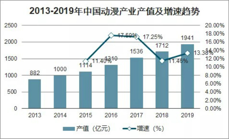 2013-2018年我国动漫产业产值总体呈逐年增长态势,2018年我国动漫产业产值为1712亿元,随着动漫文化的不断发展,动漫市场规模不断扩大,在90、00后这些互联网原住民成为漫文化“新势力”的背景下,动漫行业遇到了前所未有的“红利期”,目前市场以达到千亿规模。