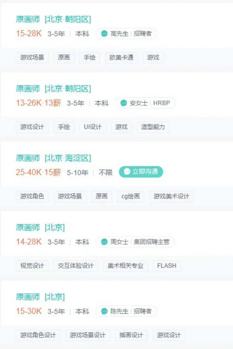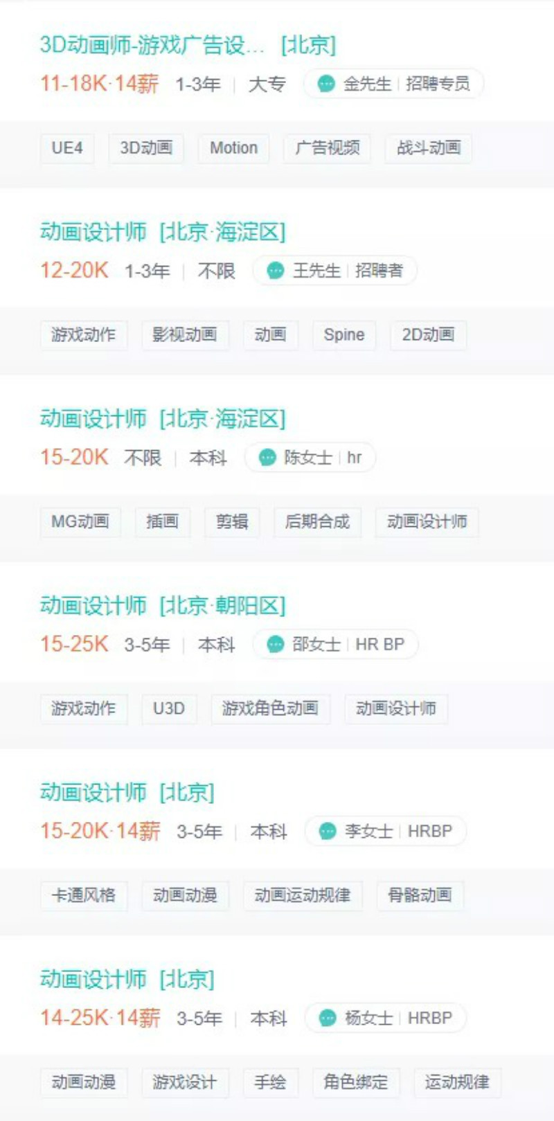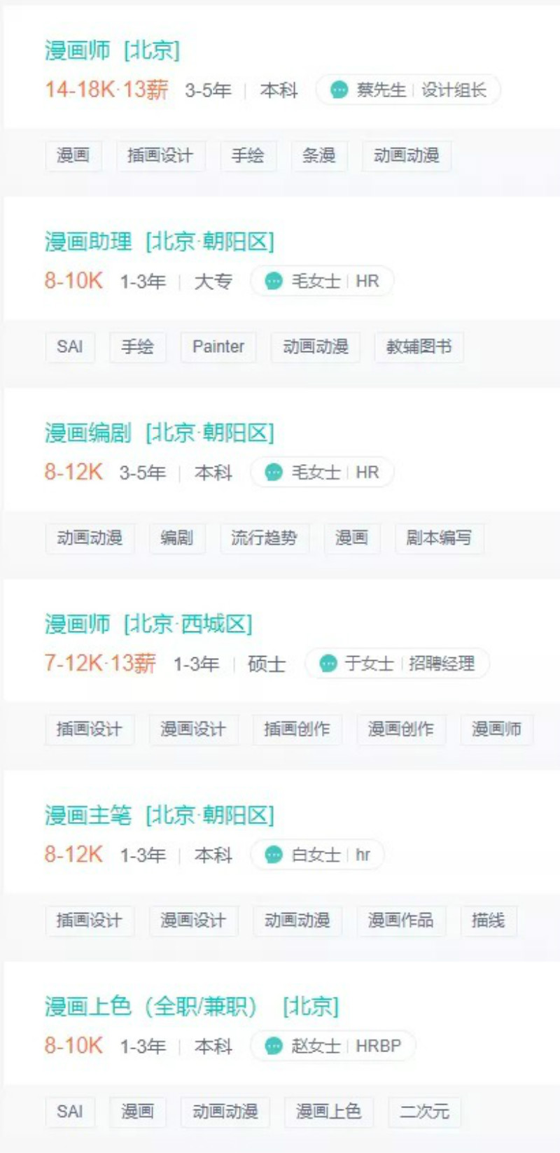 动漫相关专业的职位方向,都是非常时尚和高薪的职业,比如:漫画师、动画设计师、2D3D动作师、原画师等职位。在给企业、国家带来可观效益的同时,也给那些从事动漫相关的工作者带来了不菲的收益,人才的巨大缺口使得ACG人才身价水涨船高,很多企业高薪聘请,却也请不到想要的人才。对于动漫相关专业的年轻人来说,也诞生了更多机遇与挑战。 今年7月份,我们在BOSS直聘上随机调研了几个动漫相关专业的就业岗位。毕业后, 月薪过万唾手可得!有经验的动画高级制作人员年薪可轻松达30万元以上!