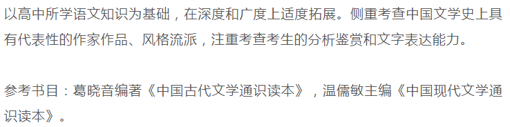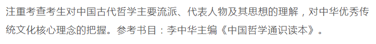 附件:文史哲三科组成一张综合试卷。试卷采用百分制,其中文学科目内容为50分,历史为30分,哲学为20分。各科目考查内容及参考书目如下: