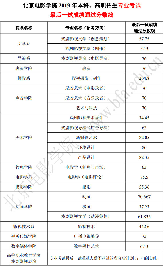 2019年北京电影学院艺术类校考合格分数线
