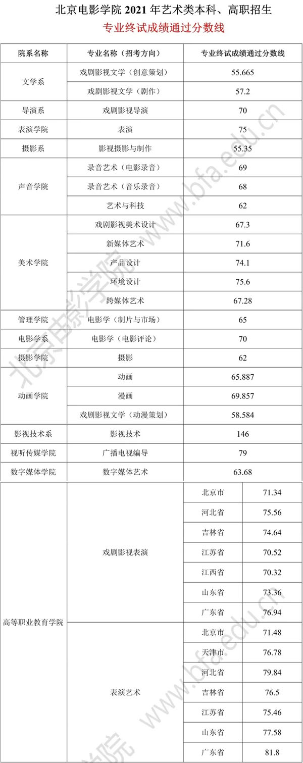 北京电影学院2021艺术类校考专业终试合格分数线