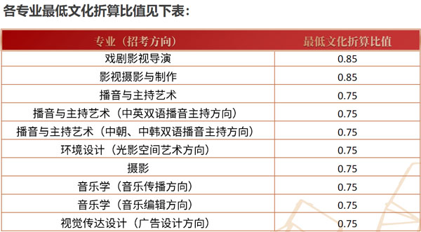戏剧影视导演、影视摄影与制作、播音与主持艺术、播音与主持艺术(中英双语播音主持方向)、播音与主持艺术(中朝、中韩双语播音主持方向)、环境设计(光影空间艺术方向)、摄影、音乐学(音乐传播方向)、音乐学(音乐编辑方向)、视觉传达设计(广 告设计方向) 10个专业(方向) ,在考生文化折算比值达到我校确定的本专业最低折算比值情况下,按照综合分(综合分=文化折算比值+专业折算比值)择优录取。综合分相同,按专业排名择优录取。
