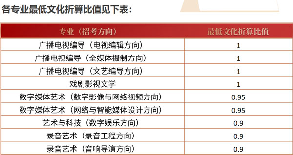 广播电视编导(电视编辑方向)、广播电视编导(全媒体摄制方向)、广播电视编导(文艺编导方向)、戏剧影视文学、数字媒体艺术(数字影像与网络视频方向)、数字媒体艺术(网络与智能媒体设计方向)、艺术与科技(数字娱乐方向)、录音艺术(录音工程方向)、录音艺术(音响导演方向) 9个专业(方向),在考生文化折算比值达到我校确定的本专业最低折算比值情况下,按文化折算比值择优录取。文化比值相同,按专业排名择优录取。