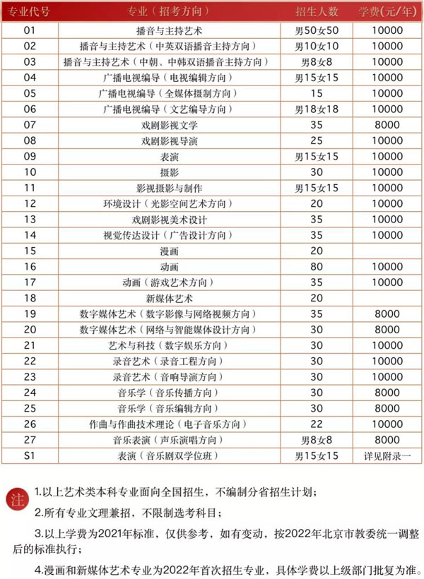 2022年中国传媒大学艺术类本科专业招生计划