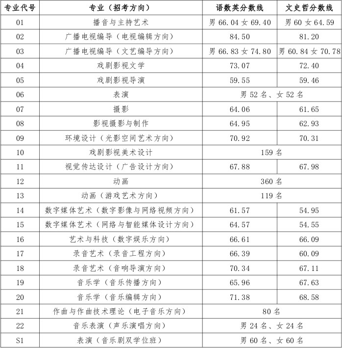 序号专业名称分数线综合分文化比值排名1播音与主持艺术(男)2.132播音与主持艺术(女)2.112广播电视编导(电视编辑方向)1.0913广播电视编导(文艺编导方向)(男)1.031广播电视编导(文艺编导方向)(女)北京:1.15其他:1.064戏剧影视文学1.0435戏剧影视导演2.1126表演(男)26表演(女)197摄影1.9458影视摄影与制作2.0119环境设计(光影空间艺术方向)2.02710戏剧影视美术设计5611视觉传达设计(广告设计方向)2.02212动画10813动画(游戏艺术方向)5114数字媒体艺术(数字影像与网络视频方向)1.03715数字媒体艺术(网络与智能媒体设计方向)1.04616艺术与科技(数字娱乐方向)北京:1.027其他:1.00717录音艺术(录音工程方向)1.01318录音艺术(音响导演方向)1.01819音乐学(音乐传播方向)2.02520音乐学(音乐编辑方向)1.87521作曲与作曲技术理论(电子音乐方向)2322音乐表演(声乐演唱方向)(男)17音乐表演(声乐演唱方向)(女)16S1表演(音乐剧双学位班)(男)32表演(音乐剧双学位班)(女)25X1视觉传达设计(广告设计方向)(新疆协作计划)2.126
