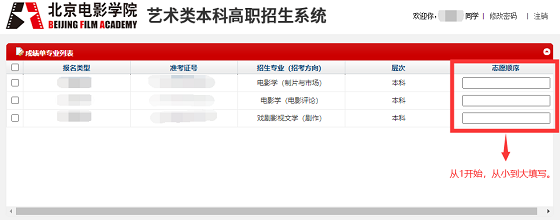 特别提示:此专业志愿顺序是供考生同时可能被多专业(招考方向)录取时参考,请考生按照自己的真实意愿填报,一经填报不得修改。例如,排在第一专业志愿的专业(招考方向)不能被录取时,将顺延至第二、第三专业志愿顺序。如遇考生在【招生系统】内填写的专业志愿顺序与高考填报的专业志愿顺序不同时,以考生填报的高考专业志愿顺序为准。