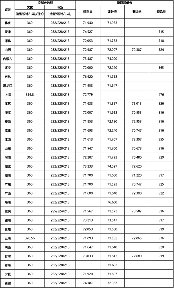 一、四川美术学院2021年各省(自治区、直辖市)艺术类提前批录取分数线