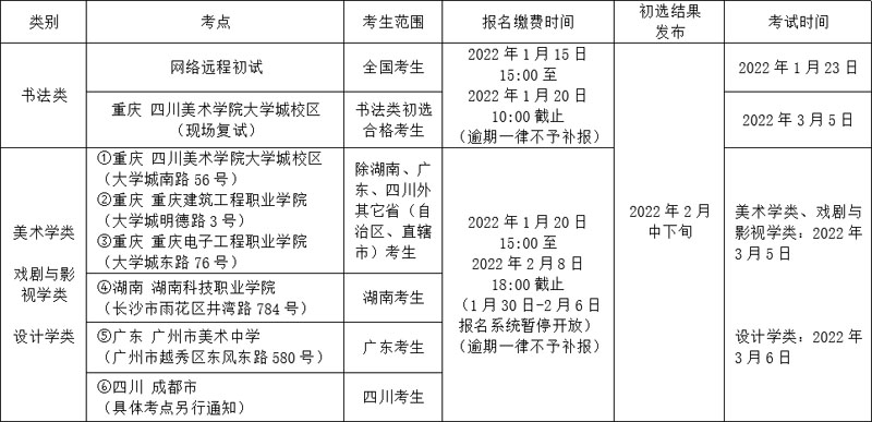 注:重庆各考点由考试报名系统随机安排,考生不自主选择。每天23:00-次日06:00为系统维护时间,系统不开放。 1.报名考试费为220元/人。 2.报名办法 (1)关注“川美招生”微信公众号,点击 “本科报名”进入报名系统。 (2)报名流程 准备有效身份证件、近期免冠照(尺寸26mm×32mm),点击【材料已准备,开始注册】→选择考生参加文化考试所在省份→填写高考报名号、上传身份证照片、填写手机号→上传近期免冠照→完善考生个人信息,注册成功→选择报考专业→确定考试科目及报考信息→上传报考资料→微信成功缴纳报名考试费→报名成功。 报名成功后,报考信息不能修改。如因个人原因需要更改报考信息,可于报名截止前作废当前报考信息后重新缴费报考。考生成功缴纳报名考试费后,一律不受理退费事宜。 (3)初选流程 书法类:网络远程初试。请考生随时关注学校招生处官网发布的有关书法类网络远程初试的相关公告。 美术学类、戏剧与影视学类、设计学类:学校通过省统考成绩对报名考生进行初选,初选合格考生方可参加现场考试,初选未合格考生学校将通过报名系统按考生缴费原路径退回报名考试费。 初选结果将在2022年2月中下旬在学校招生处微信公众号“川美招生”查询,请考生密切关注。 (二)考试