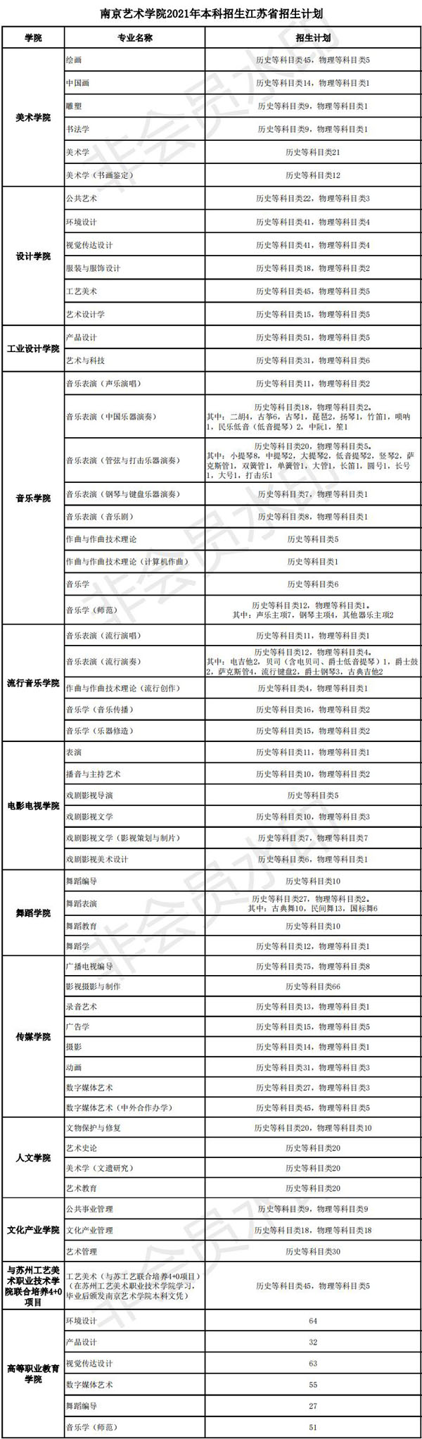 江苏省普通本科录取办法: 1.南京艺术学院美术学、美术学(书画鉴定)、艺术设计学、戏剧影视文学、戏剧影视文学(影视策划与制片)、影视摄影与制作、广告学、文物保护与修复、艺术史论、美术学(文遗研究)、艺术教育、公共事业管理、文化产业管理、艺术管理专业招收普通类(历史等科目类)或普通类(物理等科目类)考生,考生再选科目不限。在录取时,将根据以上专业,分别按历史等科目类或物理等科目类招生计划数之和确定最低录取文化分,在此分之上,按分排序,遵循志愿,依次确定考生的录取专业。专业志愿无法满足时,若服从调剂,则调剂到尚未录满的专业,不服从调剂的,作退档处理。 2.南京艺术学院在艺术类批次招生的专业,招收艺术类(历史等科目类)或艺术类(物理等科目类)考生,考生再选科目不限。 3.使用江苏省美术统考成绩录取的绘画、中国画、雕塑、公共艺术、环境设计、视觉传达设计、服装与服饰设计、工艺美术、产品设计、艺术与科技、戏剧影视美术设计、摄影、动画、数字媒体艺术专业,对文化分、专业分均达省美术统考历史等科目类或物理等科目类本科批次省控线的考生,按照江苏省教育考试院投档成绩(即[(高考文化分÷文化满分)×0.6+(专业分÷专业满分)×0.4]×750)从高分到低分择优录取。在录取时,将根据以上专业历史等科目类或物理等科目类招生计划数之和确定最低录取分,在此分之上,按分排序,遵循志愿,依次确定考生的录取专业。专业志愿无法满足时,若服从调剂,则调剂到尚未录满的专业,不服从调剂的,作退档处理。 4.使用江苏省广播电视编导统考成绩录取的广播电视编导专业,对文化分、专业分均达省广播电视编导统考历史等科目类或物理等科目类本科批次省控线的考生,按照江苏省教育考试院投档成绩(即[(高考文化分÷文化满分)×0.6+(专业分÷专业满分)×0.4]×750)从高分到低分择优录取。 5.使用南京艺术学院校考成绩录取的音乐学、音乐学(师范)、音乐学(音乐传播)、音乐学(乐器修造)专业,对音乐统考成绩合格,文化分达江苏省普通类(历史等科目类)或普通类(物理等科目类)本科批次省控线×80%的考生,按照考生的校考专业成绩和文化成绩之和(即[(高考文化分÷文化满分)×0.6+(专业分÷专业满分)×0.4]×750))从高分到低分择优录取。 6.使用南京艺术学院校考成绩录取的播音与主持艺术专业,对文化分达江苏省普通类(历史等科目类)或普通类(物理等科目类)本科批次省控线×85%的考生,按照考生的校考专业成绩从高分到低分择优录取。 7.使用南京艺术学院校考成绩录取的戏剧影视导演、录音艺术专业,对文化分达江苏省普通类(历史等科目类)或普通类(物理等科目类)本科批次省控线×80%的考生,按照考生的校考专业成绩从高分到低分择优录取。 8.使用南京艺术学院校考成绩录取的书法学、舞蹈学专业,对文化分达江苏省普通类(历史等科目类)或普通类(物理等科目类)本科批次省控线×80%的考生,按照考生的文化成绩从高分到低分择优录取。 9.使用南京艺术学院校考成绩录取的表演专业,对文化分达江苏省普通类(历史等科目类)或普通类(物理等科目类)本科批次省控线×75%的考生,按照考生的校考专业成绩从高分到低分择优录取。 10.使用南京艺术学院校考成绩录取的音乐表演(声乐演唱)、音乐表演(中国乐器演奏)、音乐表演(管弦与打击乐器演奏)、音乐表演(钢琴与键盘乐器演奏)、音乐表演(音乐剧)、音乐表演(流行演唱)、音乐表演(流行演奏)、作曲与作曲技术理论、作曲与作曲技术理论(计算机作曲)、作曲与作曲技术理论(流行创作)专业,对省音乐统考成绩合格,文化分达江苏省普通类(历史等科目类)或普通类(物理等科目类)本科批次省控线×75%的考生,按照考生的校考专业成绩从高分到低分择优录取。 注:作曲与作曲技术理论、作曲与作曲技术理论(计算机作曲)专业实行的是合并考试,成绩通用。在录取时,将根据两个专业历史等科目类或物理等科目类招生计划数之和确定最低录取专业分,在此分之上,按分排序,遵循志愿,依次确定考生的录取专业。专业志愿无法满足时,若服从调剂,则调剂到尚未录满的专业,不服从调剂的,作退档处理。 11.使用南京艺术学院校考成绩录取的舞蹈编导专业,对文化分达江苏省普通类(历史等科目类)或普通类(物理等科目类)本科批次省控线×65%的考生,按照考生的校考专业成绩从高分到低分择优录取。 12.使用南京艺术学院校考成绩录取的舞蹈教育专业,对文化分达江苏省普通类(历史等科目类)或普通类(物理等科目类)本科批次省控线×60%的考生,按照考生的校考专业成绩从高分到低分择优录取。 13.使用南京艺术学院校考成绩录取的舞蹈表演专业,对文化分达江苏省普通类(历史等科目类)或普通类(物理等科目类)本科批次省控线×50%的考生,按照考生的校考专业成绩从高分到低分择优录取。 14.我校与英国普利茅斯大学联合培养数字媒体艺术专业本科教育项目,第四学年起,符合条件的学生可赴英国学习。使用江苏省美术统考成绩录取,对文化分、专业分均达省美术统考历史等科目类或物理等科目类本科批次省控线的考生,按照江苏省教育考试院投档成绩(即[(高考文化分÷文化满分)×0.6+(专业分÷专业满分)×0.4]×750)从高分到低分择优录取。 15.我校与苏州工艺美术职业技术学院的“高职与普通本科