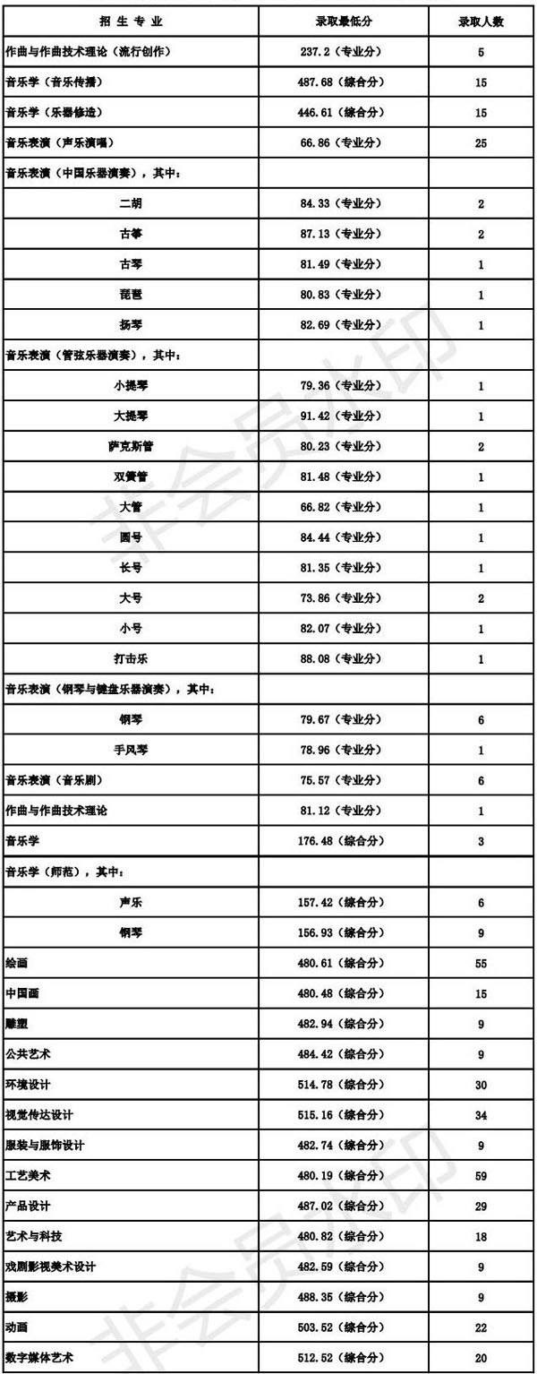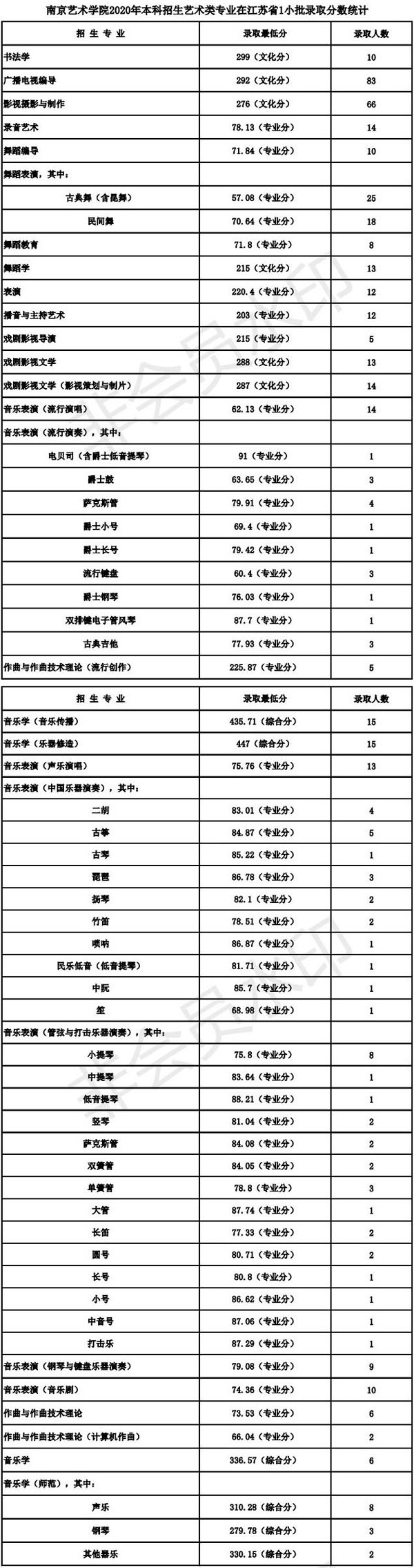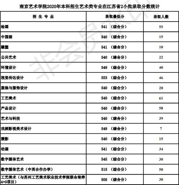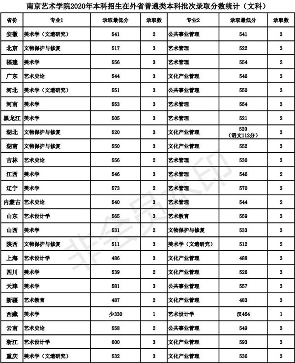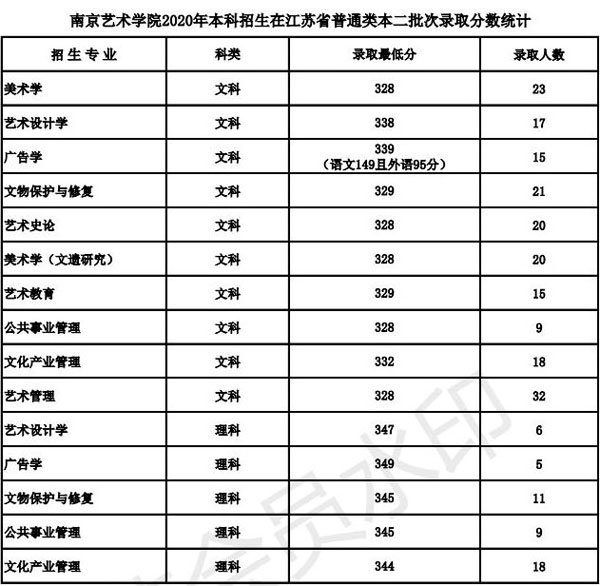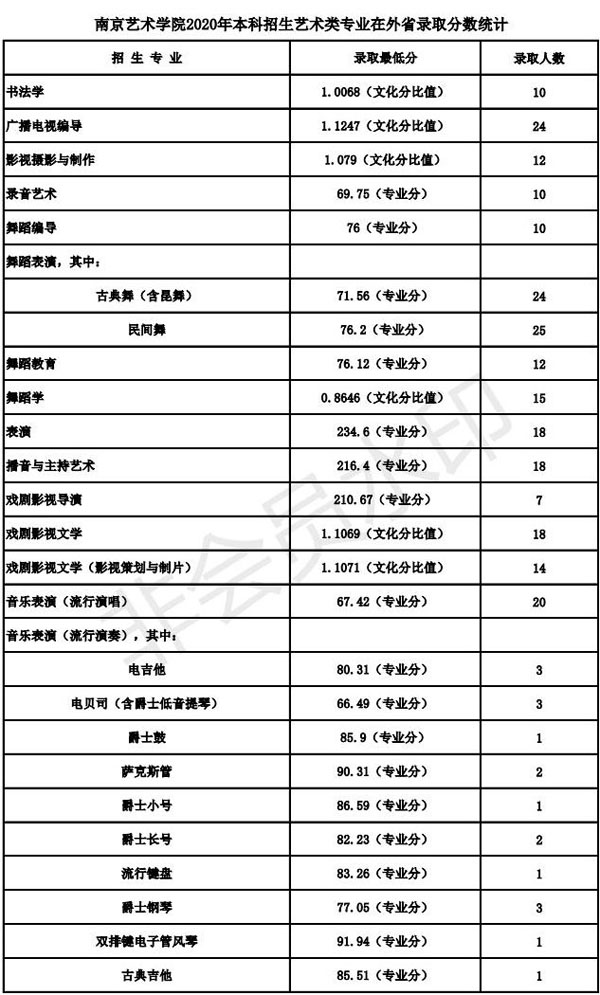南京艺术学院2020年录取规则录取规则 一、学校部分艺术类专业对报名的身体条件为: 1、音乐表演(声乐演唱、流行演唱、音乐剧)专业:发声器官、听觉器官无实质性病变,男生身高1.70米以上、女生身高1.60米以上,专业特别优秀者,条件可适当放宽;2、音乐表演(中国乐器演奏、管弦与打击乐器演奏、钢琴与键盘乐器演奏、流行演奏)专业:听觉器官无实质性病变;3、表演、播音与主持艺术专业:口齿清楚、发声、听觉器官无疾病,男生身高1.73米以上、女生身高1.63米以上,专业特别优秀者,条件可适当放宽;4、舞蹈表演专业:男生身高1.75米以上、女生身高1.65米以上,专业特别优秀者,条件可适当放宽;5、录音艺术专业:听觉器官无实质性病变。 二、学校严格执行教育部颁发的《普通高等学校招生体检工作指导意见》及有关规定(特殊专业体检及要求)。学校对录取新生的男女比例无要求。 三、我校在艺术类批次招生的专业,考生均须按照《南京艺术学院2020年本科招生简章》要求,参加相应专业的省级统考及我校校考。 四、学校依据教育部和有关省(自治区、直辖市)对高校招生录取工作的要求,实行学校负责、省(自治区、直辖市)招生部门监督的录取体制,坚持德、智、体、美、劳全面衡量,按公平、公开、公正和择优录取的原则,根据考生考试成绩和公布的招生计划,严格按招生的有关规定进行录取。 五、南京艺术学院2020年普通本科招生江苏省录取办法: 1、南京艺术学院美术学、艺术设计学、广告学、文物保护与修复、艺术史论、美术学(文遗研究)、艺术教育、公共事业管理、文化产业管理、艺术管理专业招收普通类文科和理科考生,学业水平测试科目中,选测科目等级要求BC,必测科目等级要求5合格。在录取时,将根据以上专业,分别按文科或理科招生计划数确定最低录取文化分,在此分之上,按分排序,遵循志愿,依次确定考生的录取专业。专业志愿无法满足时,若服从调剂,则调剂到尚未录满的专业,不服从调剂的,作退档处理。 2、南京艺术学院艺术类招生专业,七门学业水平测试科目中必须有四门(含四门)以上合格,且综合素质评价中道德品质、公民素养、技术科目均须合格。 3、使用江苏省美术统考成绩录取的绘画、中国画、雕塑、公共艺术、环境设计、视觉传达设计、工艺美术、产品设计、艺术与科技、服装与服饰设计、摄影、数字媒体艺术、动画、戏剧影视美术设计专业,对文化分(即考生语文、数学、外语三门原始分(不含附加分)与政策性奖励分、照顾分之和)、专业分均达省美术统考本科批次省控线的考生,按照考生的文化分与美术统考专业分之和从高分到低分择优录取。在录取时,将根据以上专业招生计划数之和确定最低录取综合分(文化分+美术统考专业分),在此综合分之上,按分排序,遵循志愿,依次确定考生的录取专业。专业志愿无法满足时,若服从调剂,则调剂到尚未录满的专业,不服从调剂的,作退档处理。 4、使用南京艺术学院校考成绩录取的广播电视编导、影视摄影与制作、戏剧影视文学、戏剧影视文学(影视策划与制片)专业,对文化分(即考生语文、数学、外语三门原始分(不含附加分)与政策性奖励分、照顾分之和)达江苏省普通类本二文科省控线×90%×90%的考生,按照考生文化分从高分到低分择优录取。其中广播电视编导专业考生还须参加省广播电视编导统考,且成绩合格。 5、使用南京艺术学院校考成绩录取的音乐学、音乐学(师范)、音乐学(音乐传播)、音乐学(乐器修造)专业,对音乐统考成绩合格,文化分(即考生语文、数学、外语三门原始分(不含附加分)与政策性奖励分、照顾分之和)达江苏省普通类本二文科省控线×90%×80%的考生,按照考生的校考专业成绩和文化成绩之和从高分到低分择优录取。 6、使用南京艺术学院校考成绩录取的播音与主持艺术、戏剧影视导演、录音艺术专业,对文化分(即考生语文、数学、外语三门原始分(不含附加分)与政策性奖励分、照顾分之和)达江苏省普通类本二文科省控线×90%×80%的考生,按照考生的校考专业成绩从高分到低分择优录取。 7、使用南京艺术学院校考成绩录取的书法学、舞蹈学专业,对文化分(即考生语文、数学、外语三门原始分(不含附加分)与政策性奖励分、照顾分之和)达江苏省普通类本二文科省控线×90%×80%的考生,按照考生的文化成绩从高分到低分择优录取。 8、使用南京艺术学院校考成绩录取的表演专业,对文化分(即考生语文、数学、外语三门原始分(不含附加分)与政策性奖励分、照顾分之和)达江苏省普通类本二文科省控线×90%×70%的考生,按照考生的校考专业成绩从高分到低分择优录取。 9、使用南京艺术学院校考成绩录取的舞蹈编导专业,对文化分(即考生语文、数学、外语三门原始分(不含附加分)与政策性奖励分、照顾分之和)达江苏省普通类本二文科省控线×90%×65%的考生,按照考生的校考专业成绩从高分到低分择优录取。 10、使用南京艺术学院校考成绩录取的舞蹈教育专业,对文化分(即考生语文、数学、外语三门原始分(不含附加分)与政策性奖励分、照顾分之和)达江苏省普通类本二文科省控线×90%×60%的考生,按照考生的校考专业成绩从高分到低分择优录取。 11、使用南京艺术学院校考成绩录取的舞蹈表演专业,对文化分(即考生语文、数学、外语三门原始分(不含附