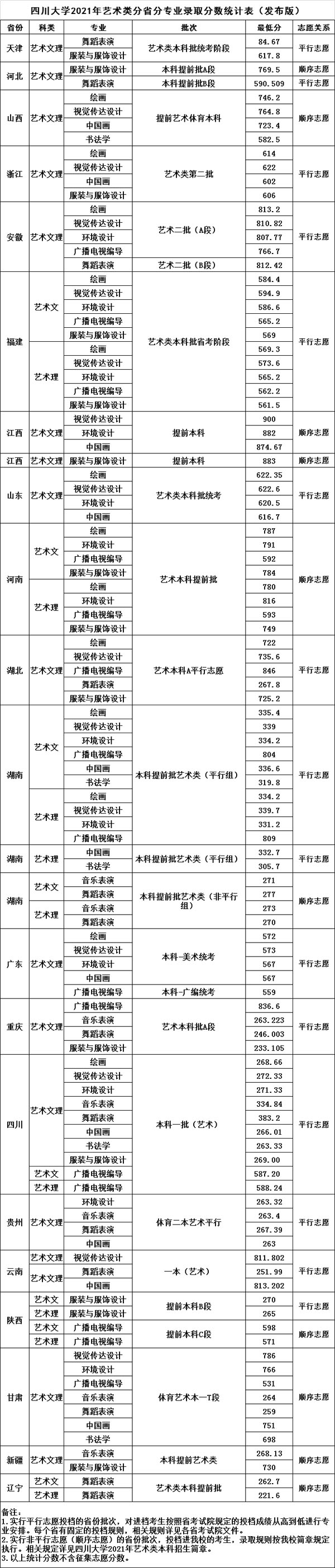 四川大学2021年艺术类本科专业录取分数线