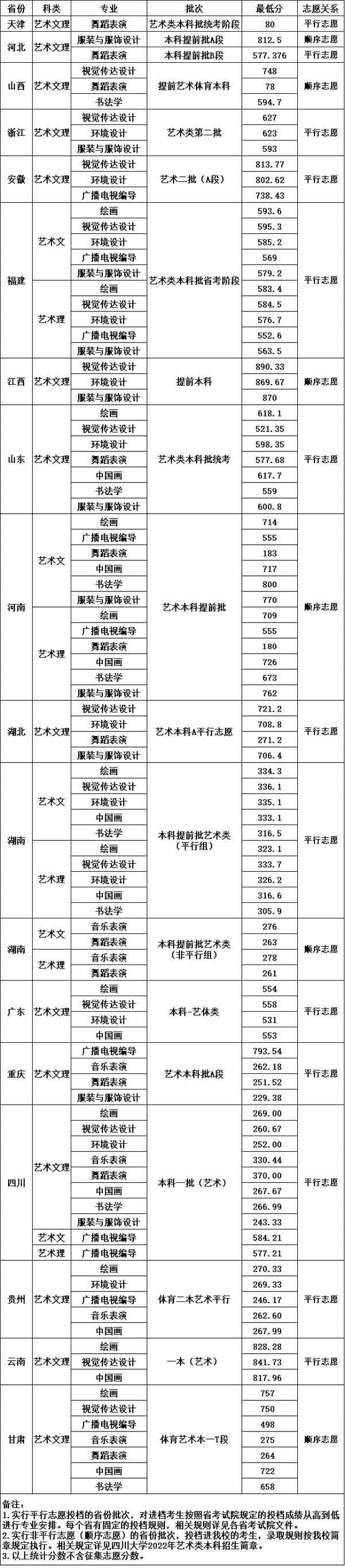 四川大学2022年艺术类本科专业录取分数线