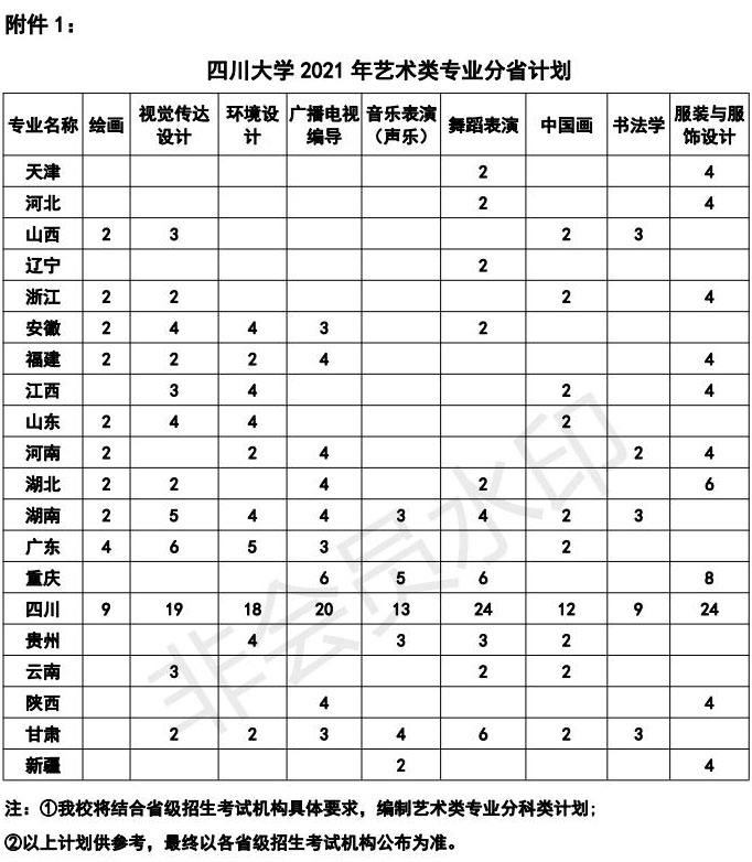 1.四川大学2021年艺术类本科招生专业为绘画、中国画、视觉传达设计、环境设计、书法学、服装与服饰设计、广播电视编导、舞蹈表演和音乐表演(声乐)九个专业。