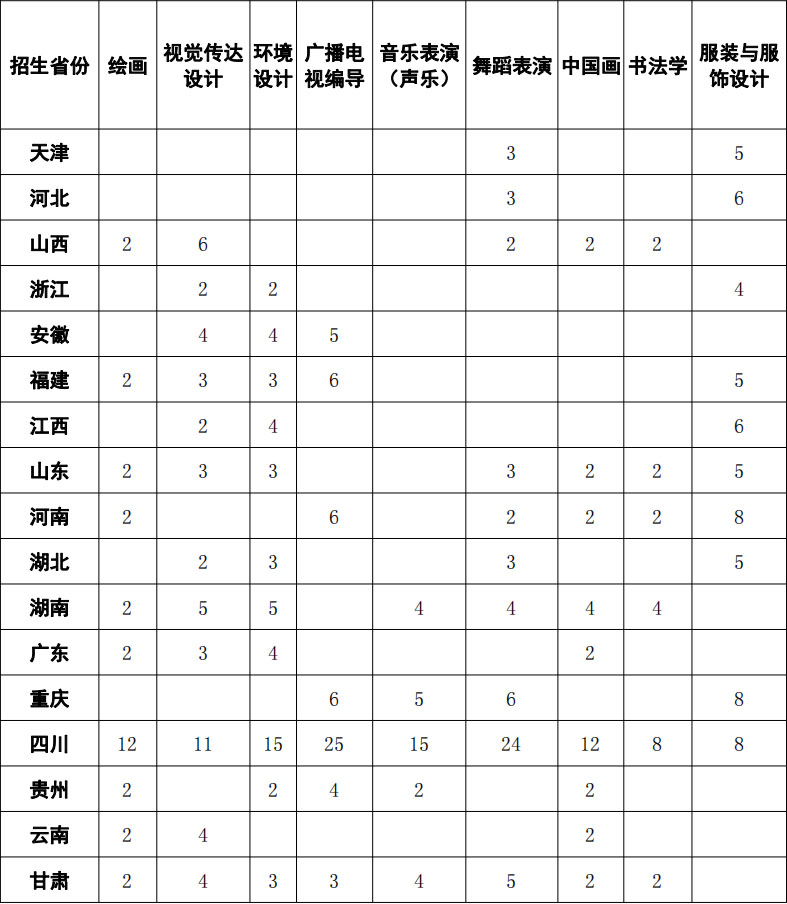 教育部关于艺术类招生的相关规定,结合我校艺术类人才培养目标,特制定本招生简章。 一、招生专业、省份及计划 1.我校2022年艺术类招生专业共十个,具体包括绘画、中国画、视觉传达设计、环境设计、书法学、服装与服饰设计、广播电视编导、舞蹈表演、音乐表演(声乐)和美术学(理论研究)。其中美术学(理论研究)专业继续在普通本科批次(一批次)招生,并执行该批次录取规则。 2.四川大学2022年艺术类专业分省计划