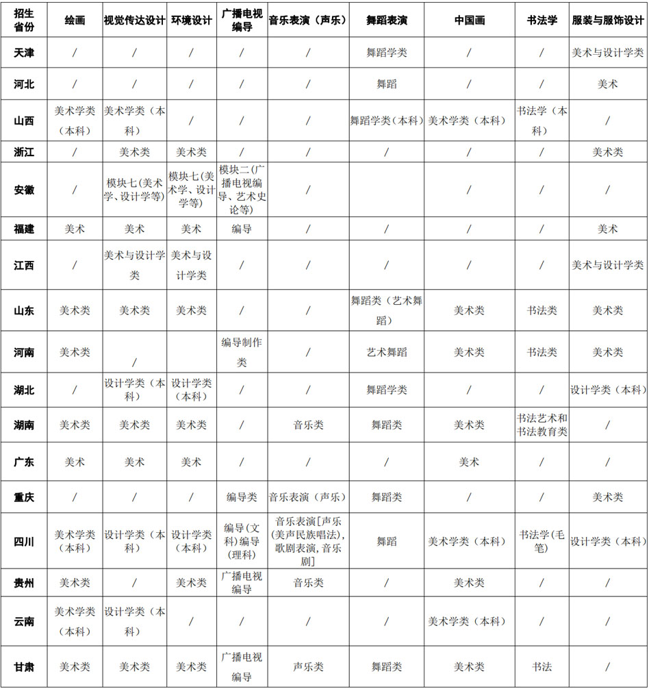 二、招生对象及报考条件 1.符合2022年教育部及生源省份艺术类专业招生条件,体检要求符合教育部等部委印发的《普通高等学校招生体检工作指导意见》及有关补充规定。 2.我校2022年艺术类各专业不组织校考,报考我校艺术类各专业的考生,须参加生源省份组织的相应专业类别省级统考,并达到省级统考本科合格线。艺术类专业省级统考子科类: