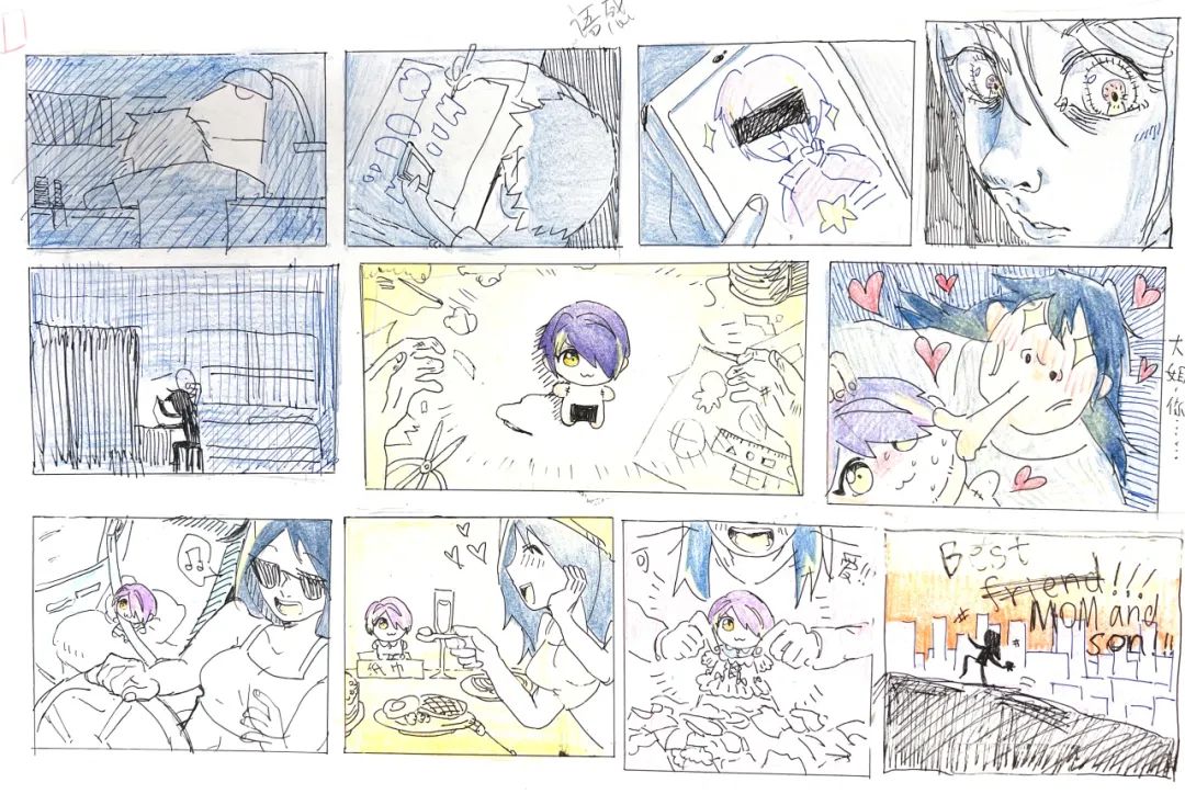 我喜欢创作故事,选择动漫是因为我希望能以这种形式将我的故事表达出来。但和其他同学不同,我在绘画上和动漫的接触仅仅停留在临摹,来到翟家班看到身边已经能创作自己角色的同学,我意识到我接下来的学习将会十分困难。