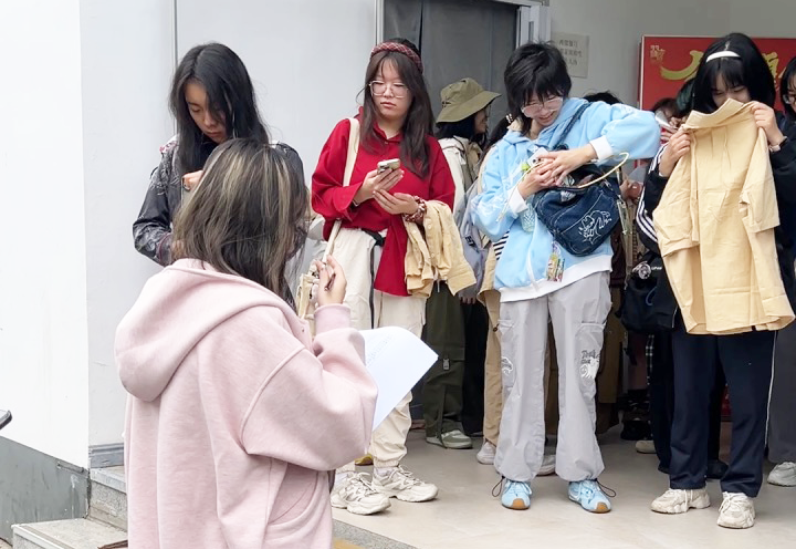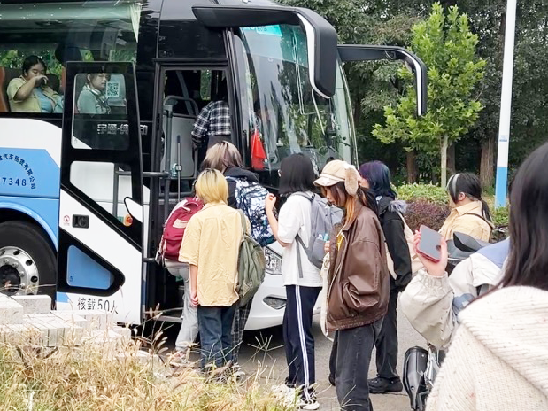 清晨集结,点名确认每位同学到位,排队上车。分发矿泉水与零食。